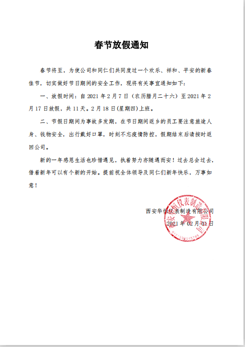 一、放假時(shí)間:自2021年2月7日(農(nóng)歷臘月二十六)至2021年2月17日放假,共11天。2月18日(星期四)上班。