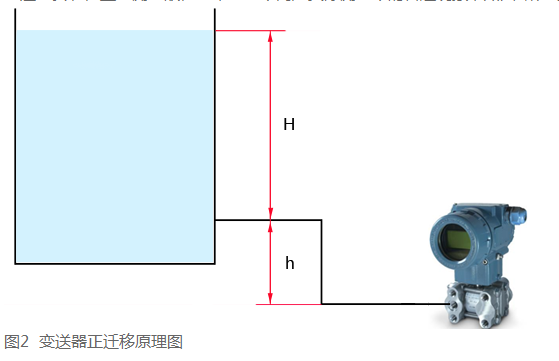 變送器安裝位置與測(cè)量液位水平高度不同是實(shí)際測(cè)量中的普遍現(xiàn)象,如圖2所示為一種遷移形式。