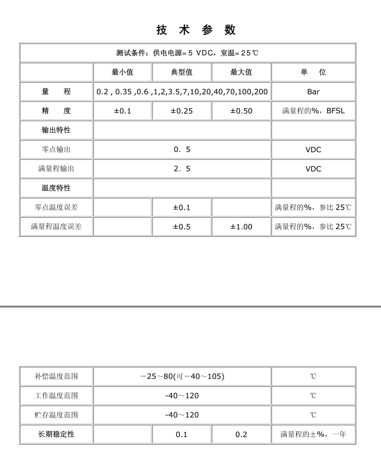 國(guó)產(chǎn)壓力變送器是將充油擴(kuò)散硅壓力傳感器芯體,通過(guò)激光焊接方式,裝入特定螺紋的壓力接口中組成。所有產(chǎn)品經(jīng)嚴(yán)格測(cè)試和篩選,利用MAX1452專(zhuān)用芯片進(jìn)行溫度補(bǔ)償和非線性校正,典型精度為0.25%,最高精度優(yōu)于0.1%,并保證在-25到80度工作溫區(qū)(最大可在-40到105度),全溫區(qū)測(cè)量精度在1%以?xún)?nèi),5V供電,輸出0.5-2.5V電壓信號(hào),適用于各種不同壓力測(cè)量產(chǎn)品的組裝和生產(chǎn)。
