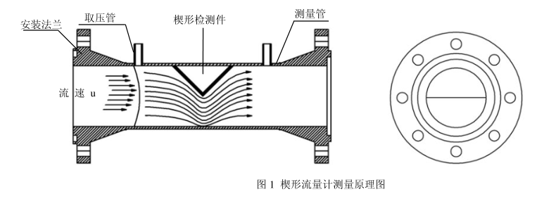 楔形流量傳感器結(jié)構(gòu)如圖1所示。楔形流量傳感器的檢測(cè)件是楔形孔板,它是一塊V形節(jié)流件,它的圓形頂角朝下,這樣有利於含懸浮顆粒(粉塵、泥沙及其它固體顆粒)流體和高粘度液體流過(guò)時(shí)在節(jié)流件上游側(cè)不會(huì)產(chǎn)生滯流,也不會(huì)在節(jié)流體上、下游側(cè)發(fā)生固體顆?;蛘吵砦锏姆e存,從而確保了楔形流量傳感器長(zhǎng)期運(yùn)行穩(wěn)定性:±0.1FS%Y,這樣高的長(zhǎng)期運(yùn)行精度在流量測(cè)量領(lǐng)域是迄今少見的。
