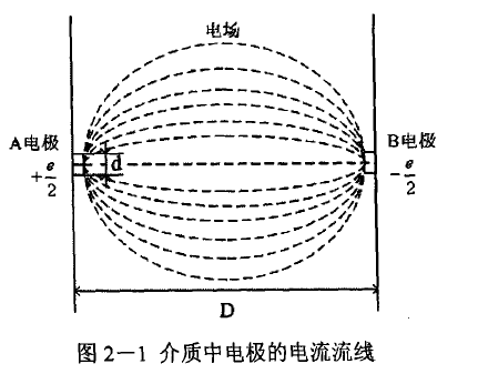 對于點電極的電磁流量計流量信號內(nèi)阻來說,如圖2-1所示,在絕緣襯里的傳感器測量管內(nèi)壁,裝有一對接液電極.電極是圓盤狀,直徑為d,電極A和電極B的距離(測量管直徑)為D(d<<D)。充滿導電液體的管道足夠長,電極所處介質的電導率s和介電常數(shù)e是均質的,對介質內(nèi)的電流場不致有所改變。在這些假定條件下,電極實際上等于埋在各個方向具有無限深層的介質內(nèi)。設兩電極間的電動勢為e,A電極的電位為+e/2,B電極的電位為-e/2。從圖2-1可以看出,電流由A電極向介質散流匯集于B電極流出。電流流動時流過的截面在電極附近最小,以后離電極愈遠愈大。也就是說離電極愈遠電流密度愈小,因而電場強度也愈小。由此可見,在電流經(jīng)過的途徑每單位長度上,介質對電流的電阻愈遠愈小.這樣,在計算傳感器信號內(nèi)阻時,可以暫把流體的體電阻視為零,僅計算兩電極與介質相接觸的接觸電阻。