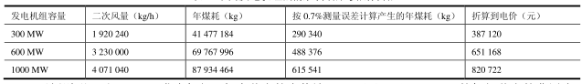 【示例二】電廠鍋爐,過量二次風(fēng)帶走大量熱量,增加煤耗。假設(shè)煙氣溫度120℃,空氣溫度30℃,因二次風(fēng)量測量精度提高0.7%,按年發(fā)電7000小時計算,可以減少煤耗為M*0.24*(120-300)/7000*0.7%,如果發(fā)電煤耗為每度電耗煤300克,每度電電價0.40元計算,由于采用平衡流量計,提高測量精度而節(jié)省的燃煤和降低的費(fèi)用如表3所示。